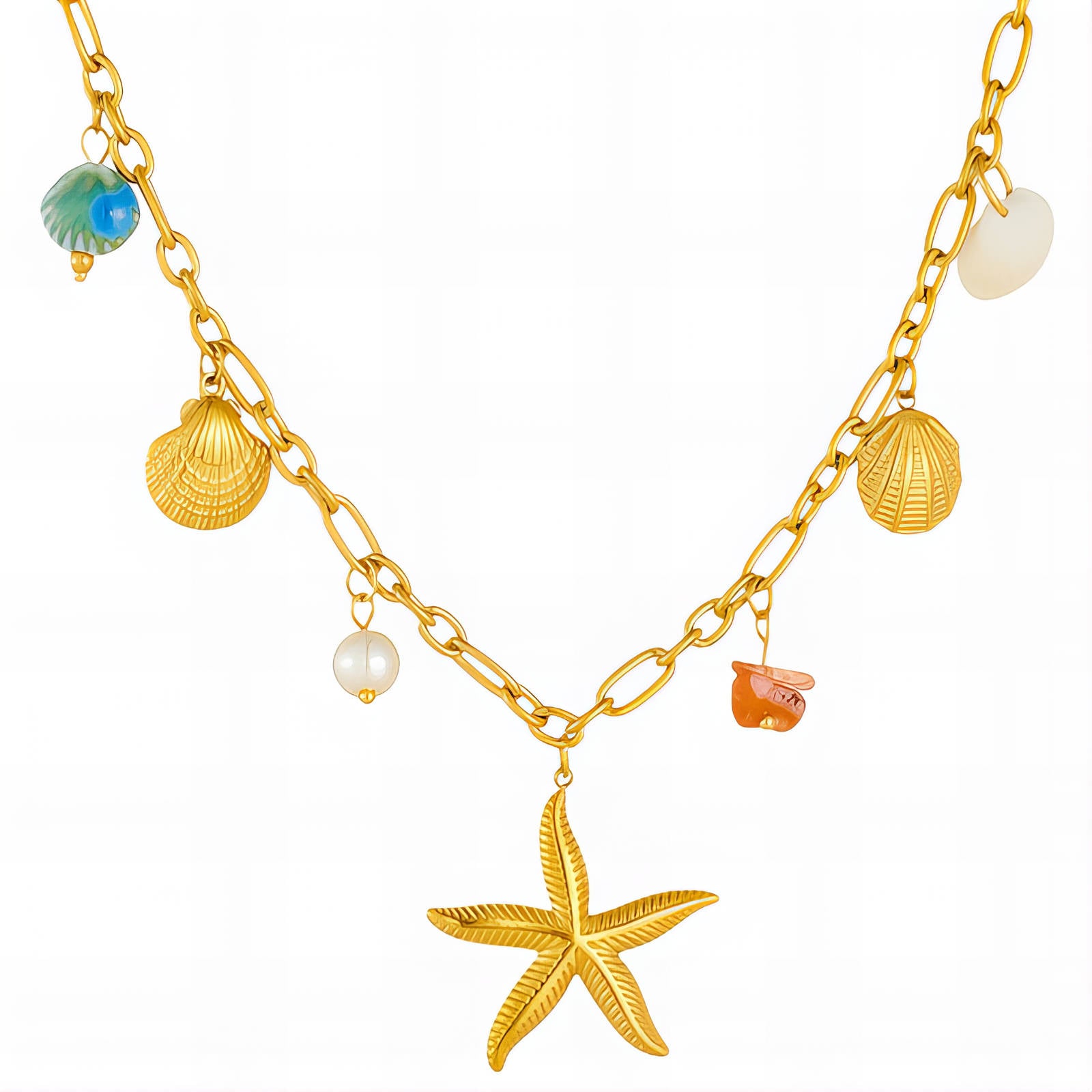 Starfish And Seashell Necklace, 18K Gold Plated Steel