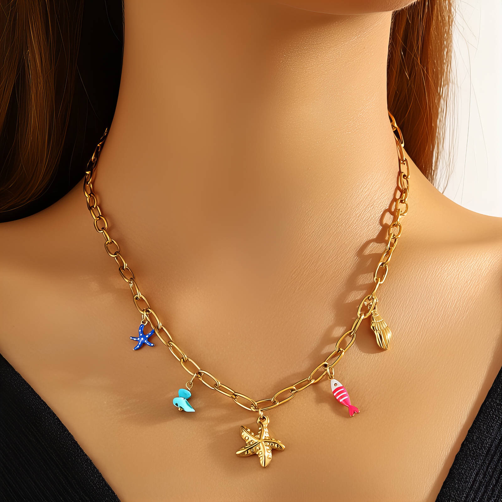 Starfish and Seashell Necklace, 18K Gold Plated Steel